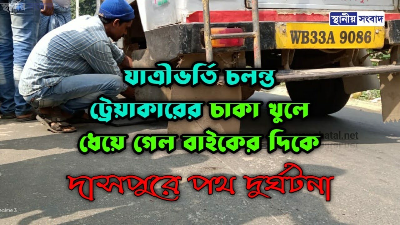 দাসপুরে পথ দুর্ঘটনা,যাত্রীভর্তি চলন্ত ট্রেয়াকারের চাকা খুলে ধেয়ে গেল বাইকের দিকে